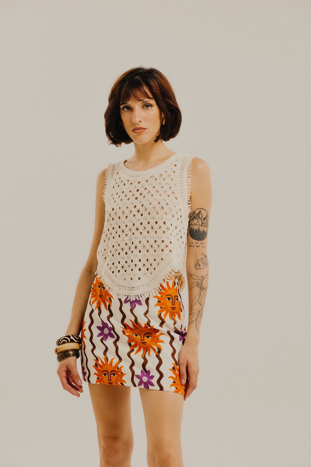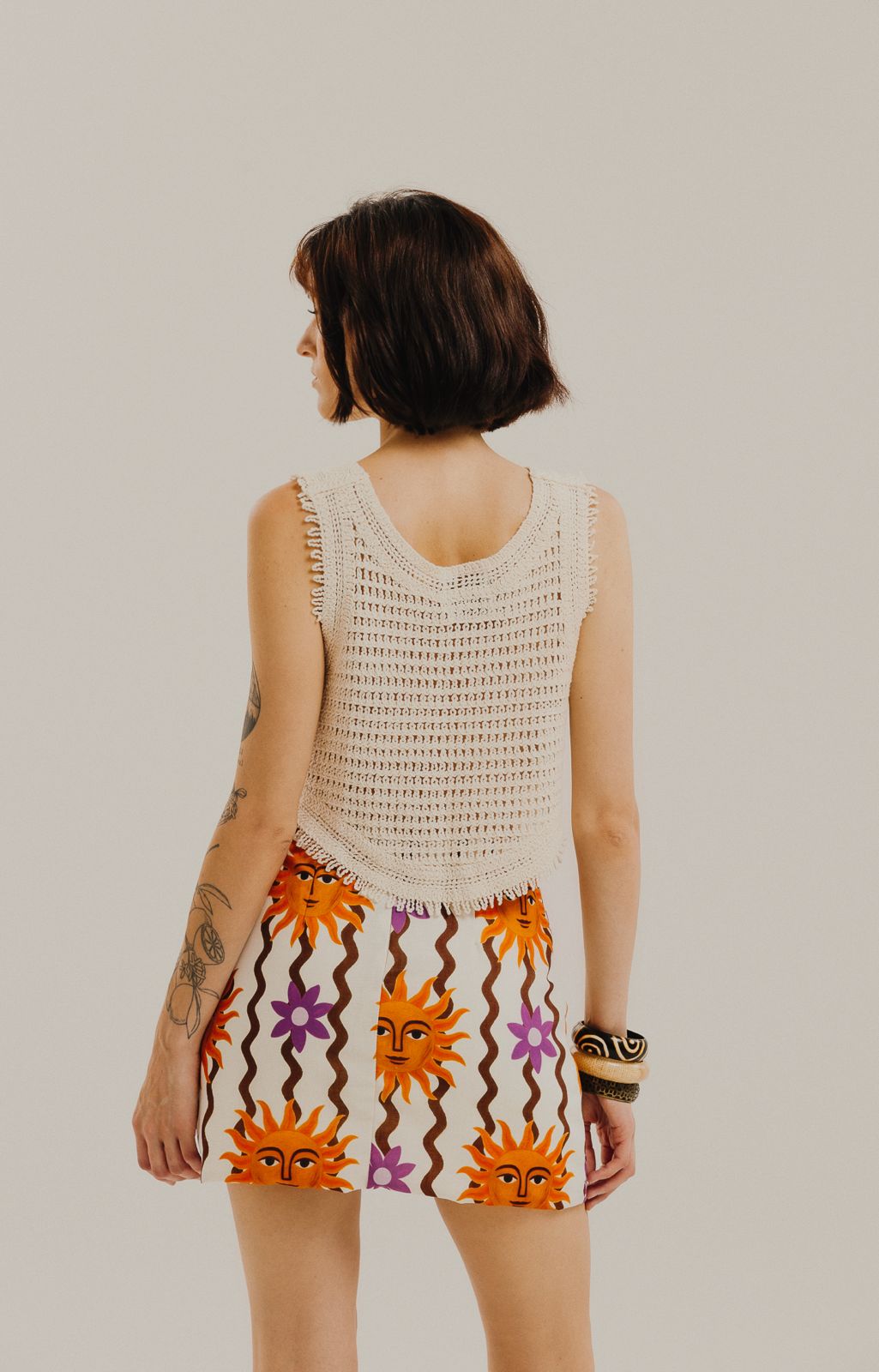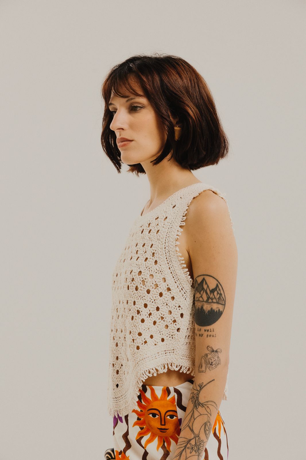 Top tejido 100% algodón, calado y liviano, con caída recta y terminación redondeada con pequeñas flecos. Ideal para superponer sobre tops y sumar textura artesanal a looks de verano.