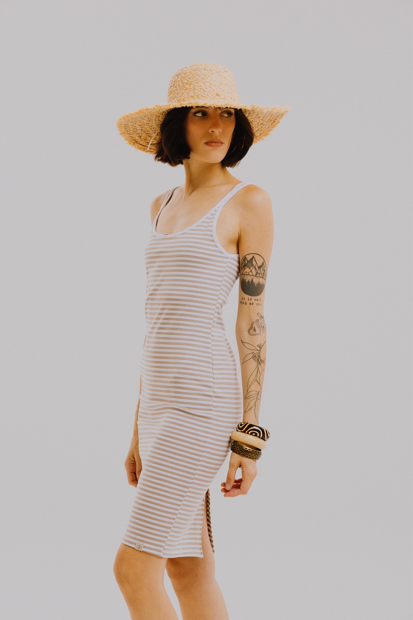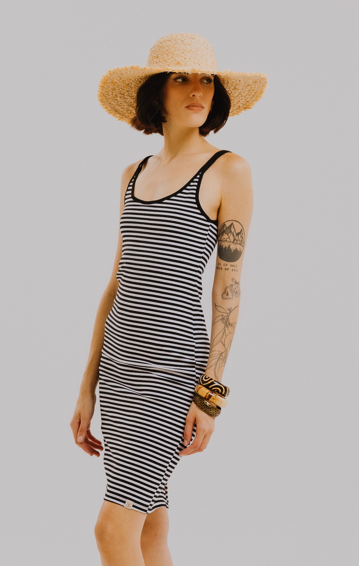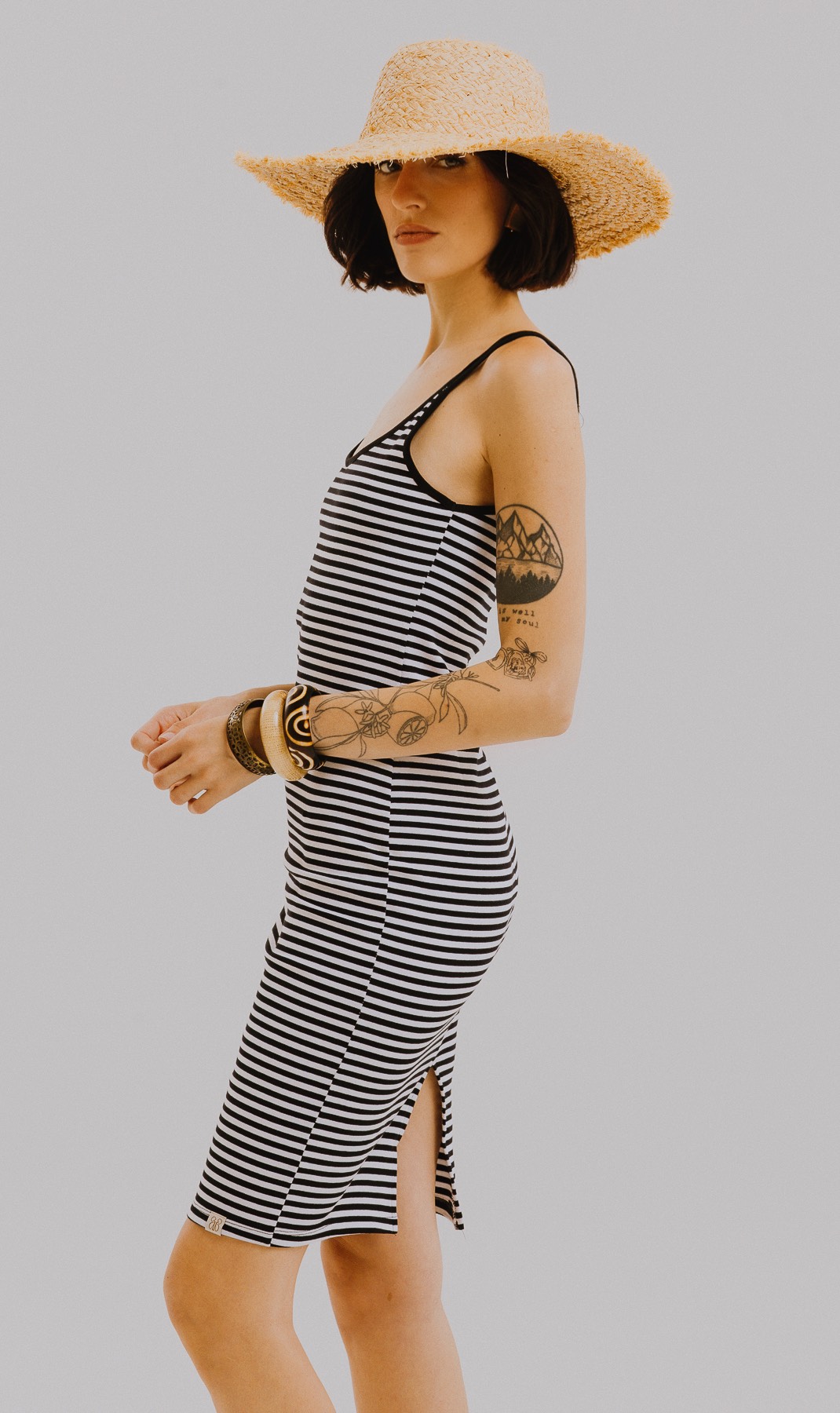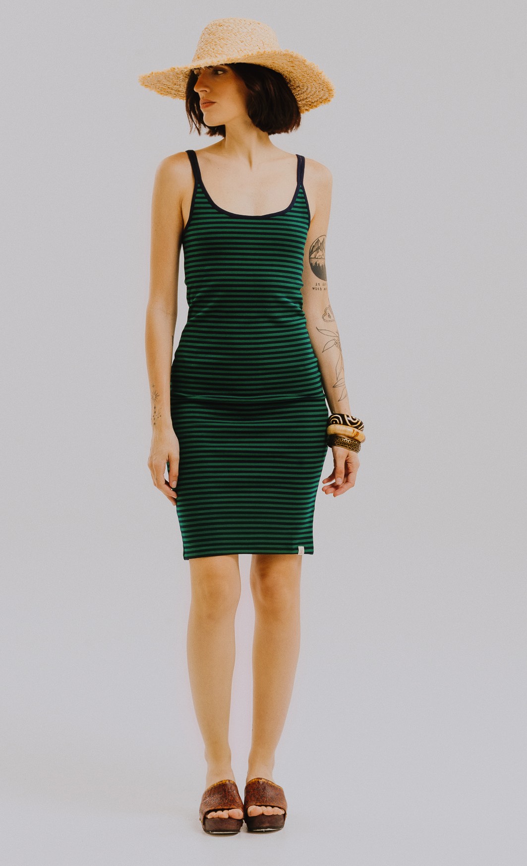Vestido solero de punto roma rayado, con breteles de ribb finos y calce al cuerpo. Largo a la rodilla con tajo en el centro inferior de la espalda que le da movimiento y lo hace muy cómodo para el día a día. Ideal para usar con sandalias o zapatillas y sumar un sombrero de rafia para lookearlo más veraniego.