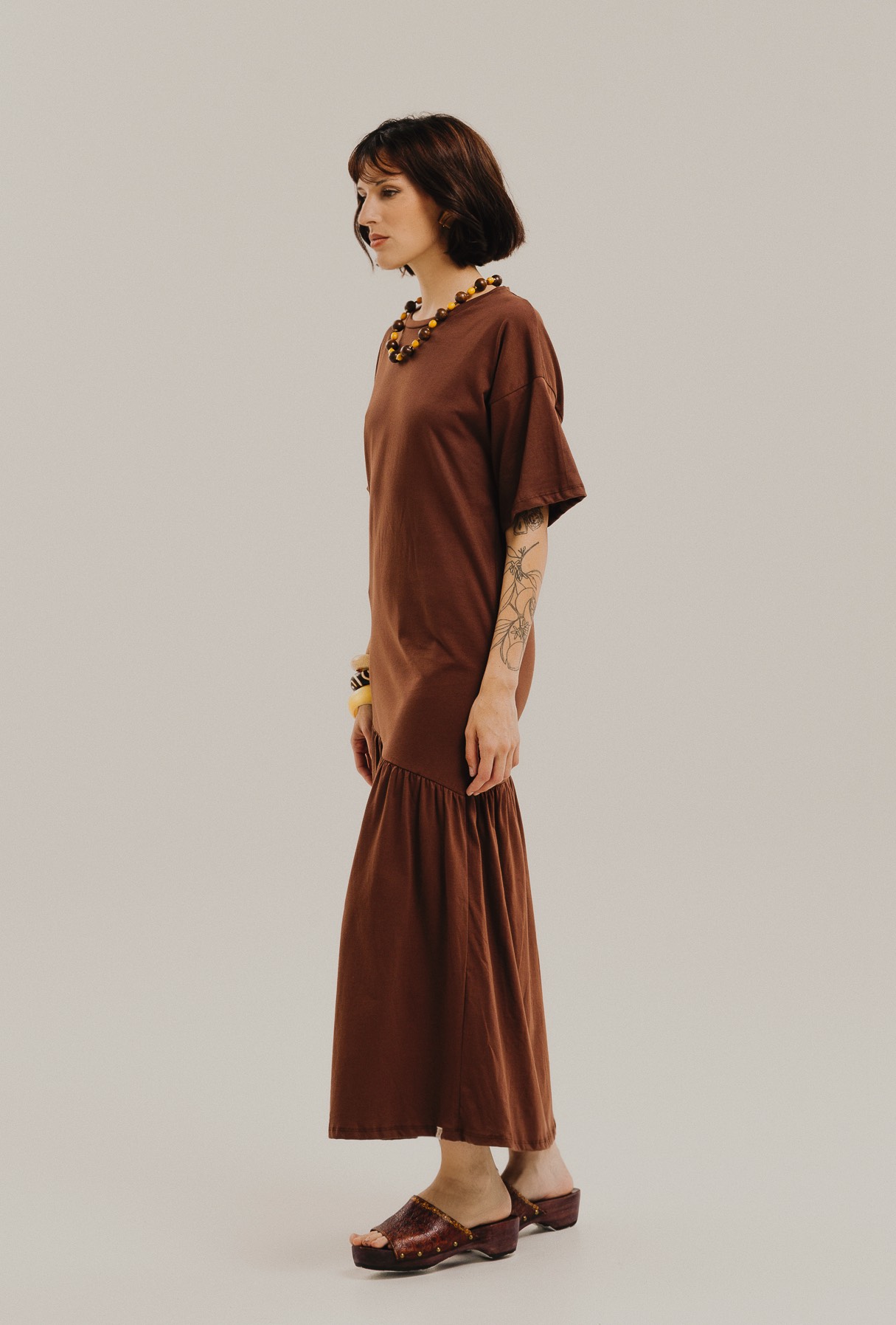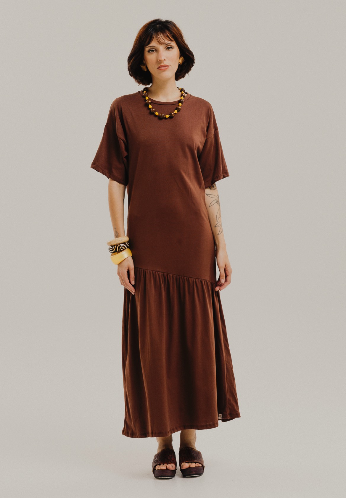 Vestido largo de jersey 100% algodón, con escote redondo, manga corta y recorte asimétrico en la falda con frunces que le da movimiento y vuelo. Calce amplio tipo remera larga, súper cómodo para todos los días; queda perfecto con zuecos, sandalias o zapatillas para un look relajado Bee Chic.